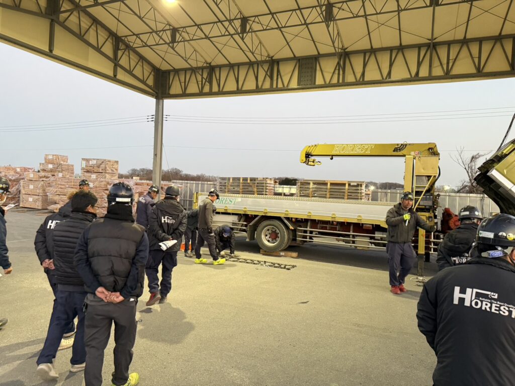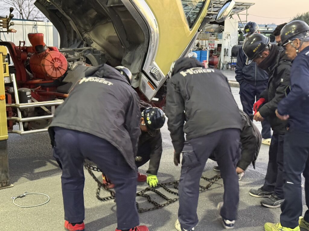 当日は、実際にタイヤチェーンを装着しながら、スムーズかつ確実に装着できるよう実技を中心に行い、万が一の状況でも落ち着いて対応できるよう訓練を行いました。